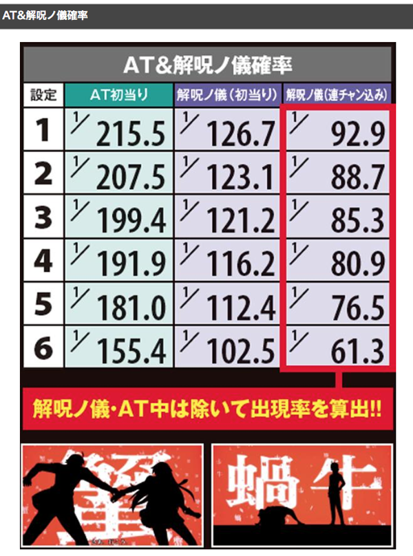AT初当りと解呪ノ儀確率も要チェック。どちらも高設定ほど高い。
