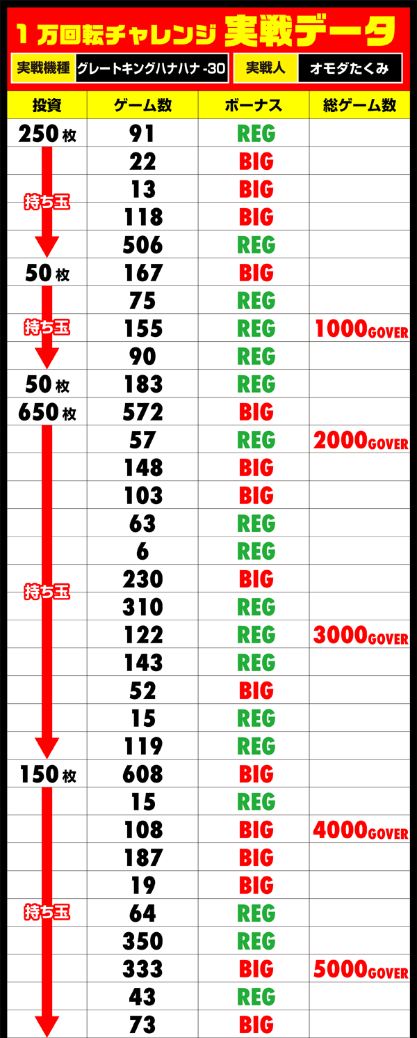 中盤から終盤にかけてもボーナス獲得ペースは変わらず、大きなタイムロスをつくらずに、着実に前進するオモダたくみ。