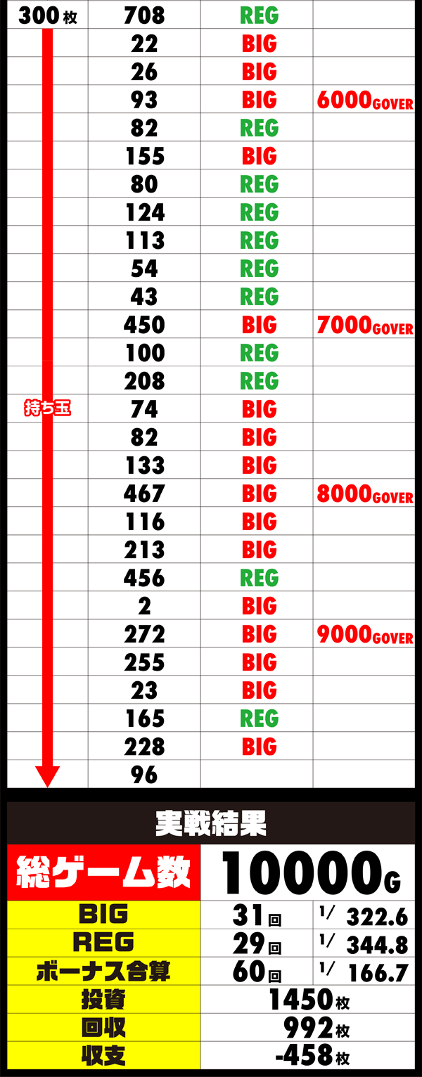 9時オープンといったアドバンテージもあり、21時には9000Gを突破して、余裕の1万回転達成となった。