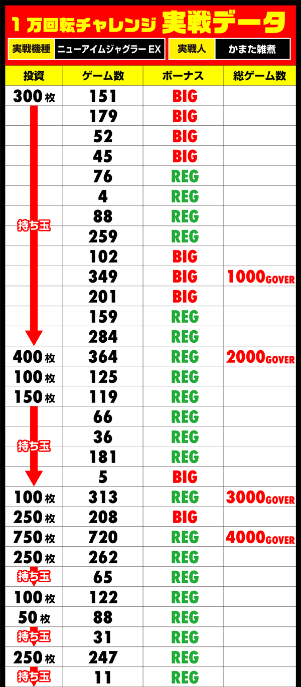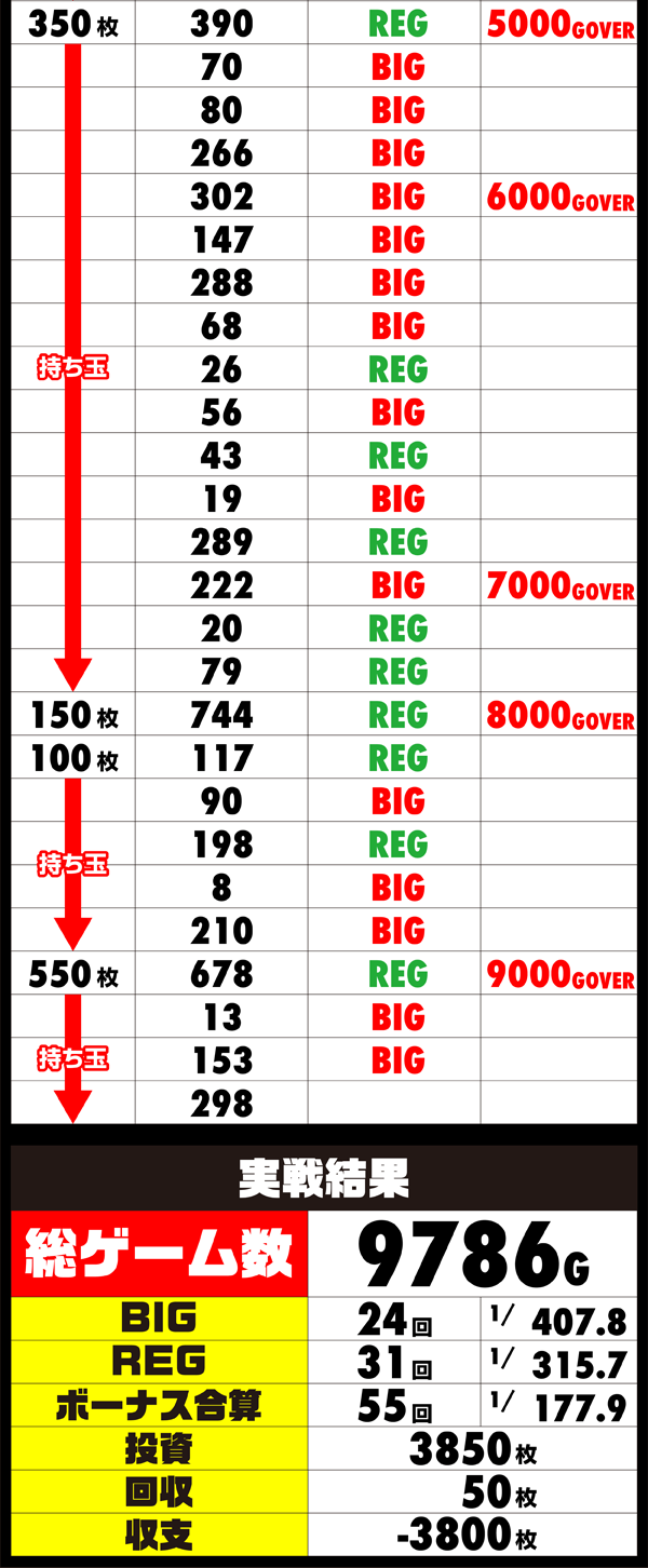 最後までチャレンジ成功に有利な展開は続いたものの、閉店時の総回転数は9768G。