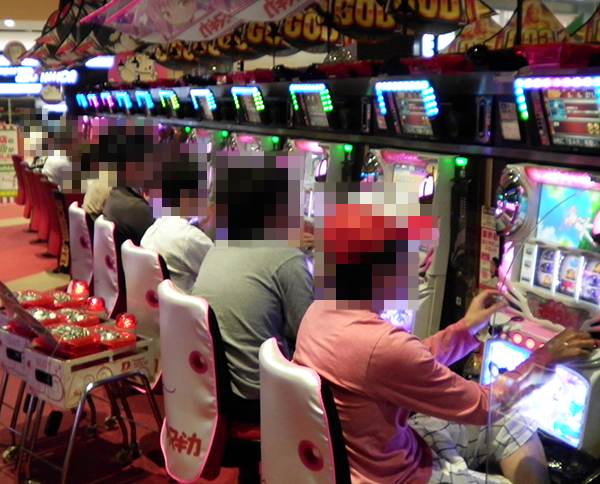 5円パチスロの「押忍!番長3」や「ミリオンゴッド-神々の凱旋-」にも、笑顔のプレイヤーが多い。