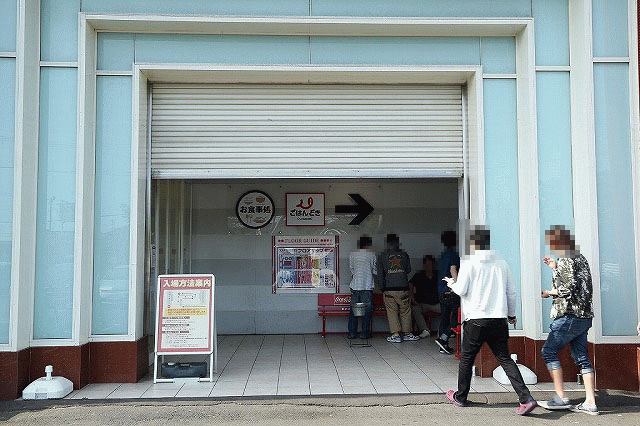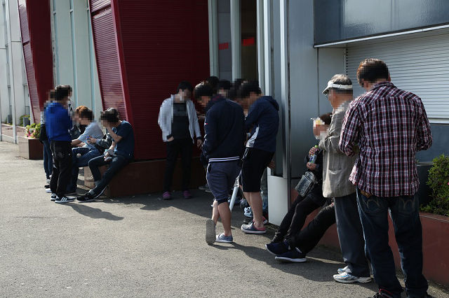 店舗の軒下スペースで、開店を待つ多くのファン。