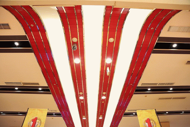 中央通路には、レイアウト変更を行った1円パチンコのPOPやのぼりがヒシメく、揺らめく、さんざめく!