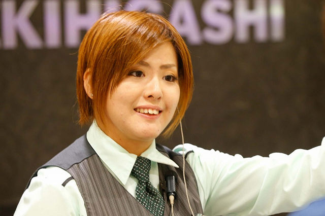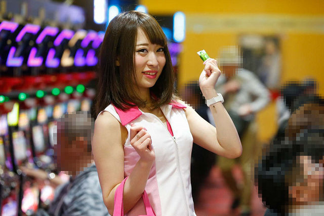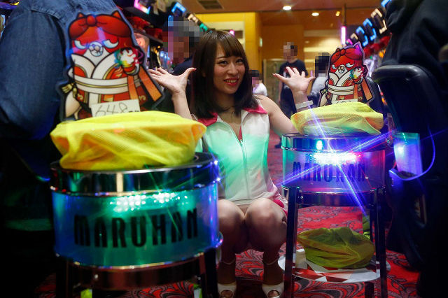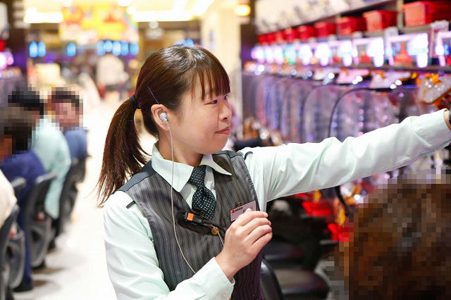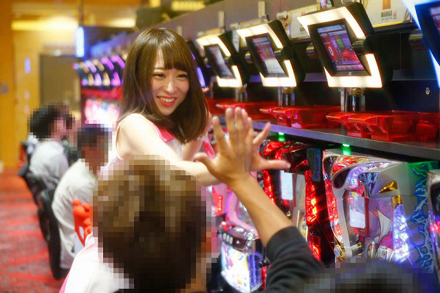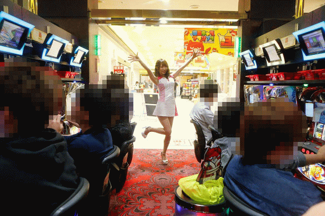 708台ほぼ満席の店内。遊技するファンへ、るいちゃんが元気にご挨拶!