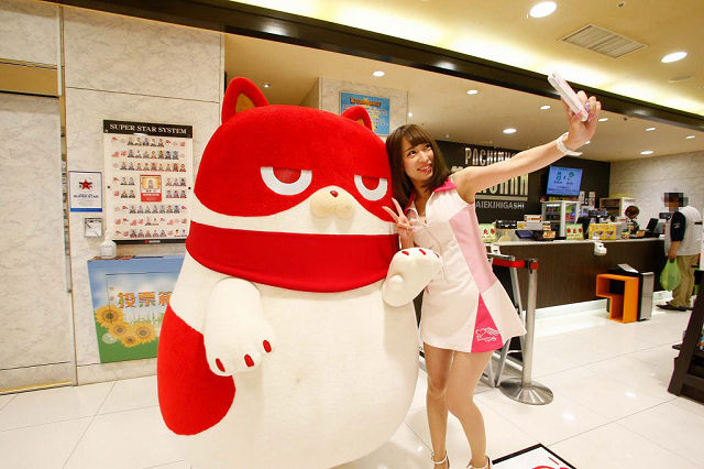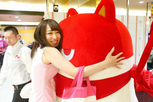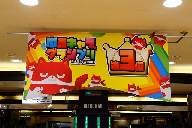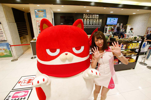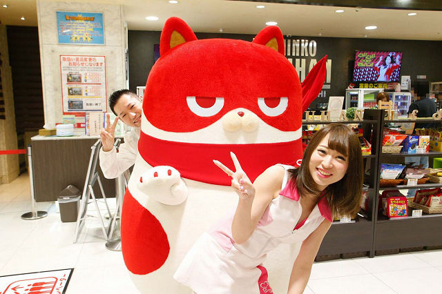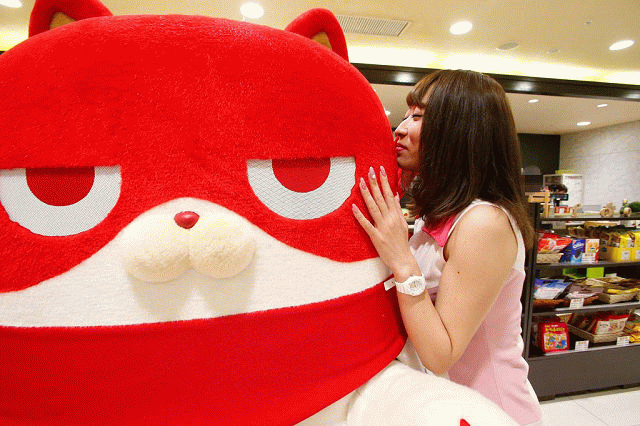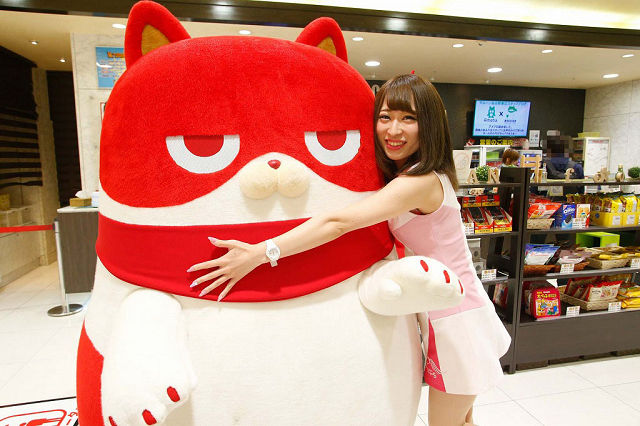 ファンが集結する前、まだ閉ざされているシャッター。だが、そこに佇むにゃんまるの肖像は、愛くるしさ抜群だ