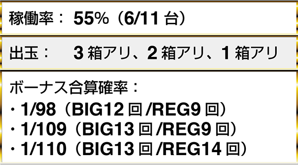 ・『マイジャグラーⅡ』にボーナス合算確率1/120以下が3台