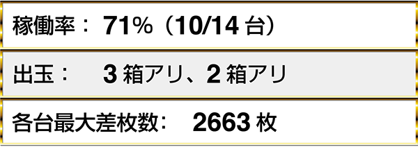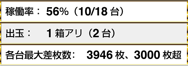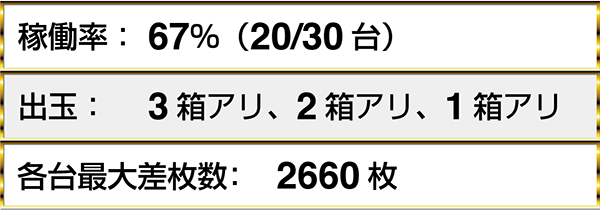 『バジリスク~甲賀忍法帖~絆』をはじめ、3機種以上で3箱を超える出玉を目撃した。