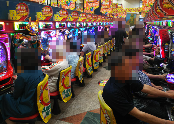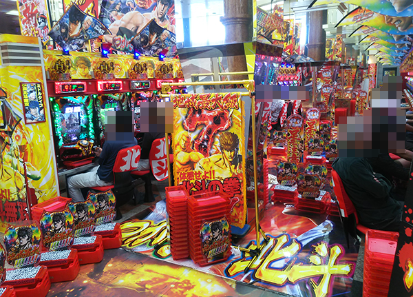 4円パチンコのなかで、注目を集めていたのが海物語シリーズと「ぱちんこCR真・北斗無双」。華麗なパフォーマンスを披露するプレイヤーが多く、シマ全体が盛り上がっていた。