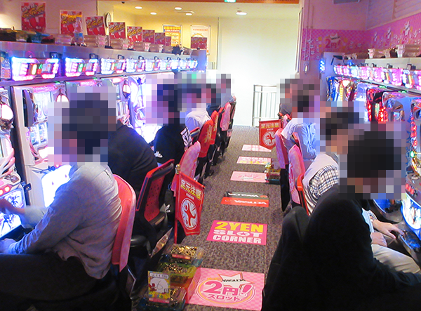 14時頃の20円パチスロでは、「バジリスク~甲賀忍法帖~絆」や「沖ドキ!」などに魅力的なシーンを目撃。イキイキとした表情でレバーを叩く姿も目立っており、明るいムードが感じられた。