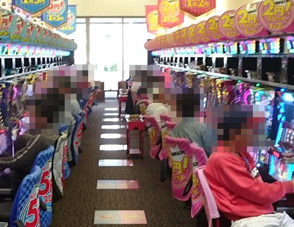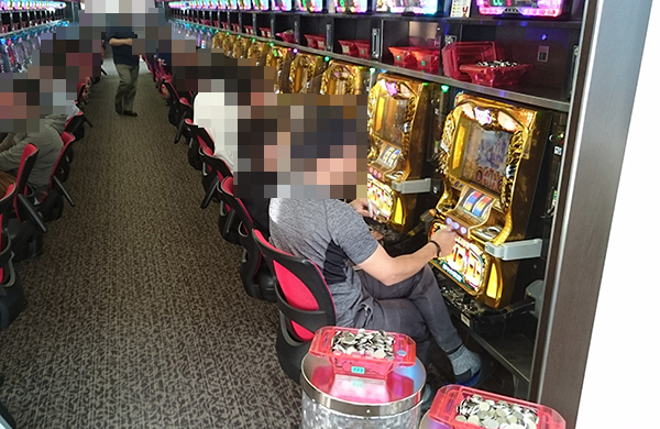 5円パチスロの「押忍!番長3」や2円パチスロの「沖ドキ!トロピカル」など、さまざまな機種に遊技を満喫しているようなプレイヤーの姿があった。