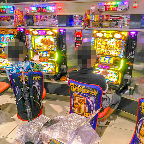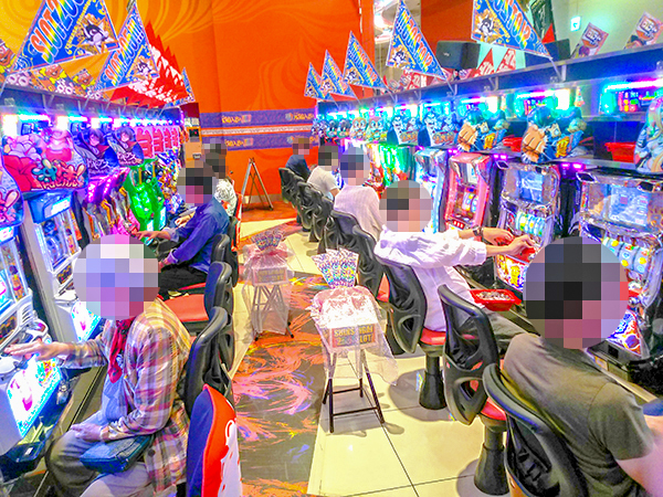 取材時の店内には多くのプレイヤーが来店。パチンコ・パチスロ共に、様々な機種が支持を集めていた。