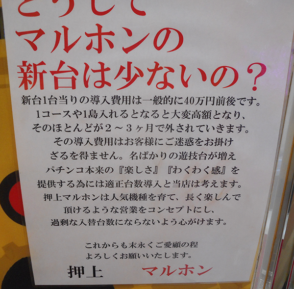 取材中に見つけた新台入替に関する張り紙からは、いかにプレイヤー目線でホール作りをしているかが伝わってきた。