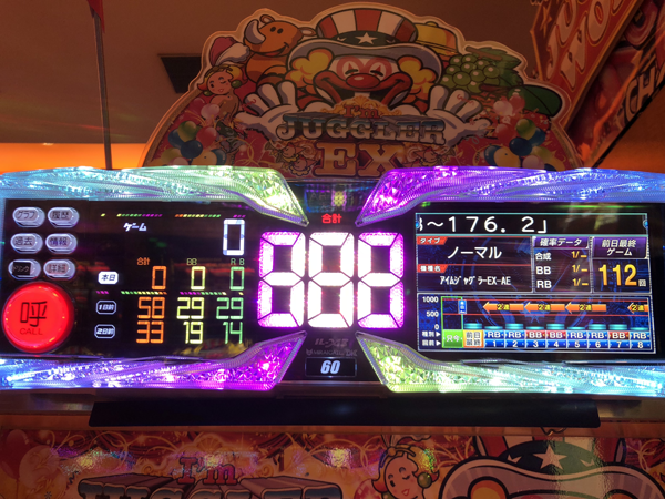 「アイムジャグラーEX-AE」でも周囲とおなじような展開をみせ、順調にボーナス回数を伸ばしていった。