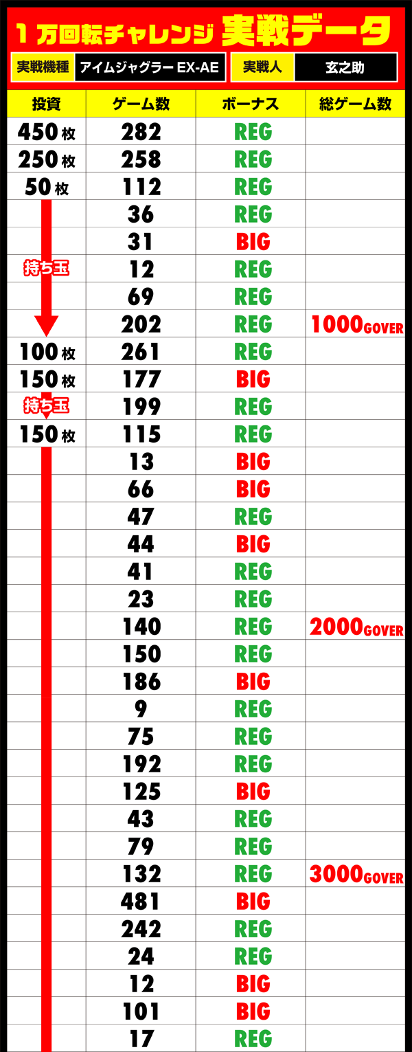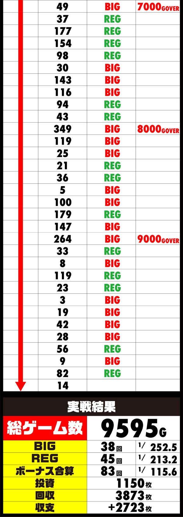 REGが先行するも純粋にボーナス獲得回数が多く、タイムロスは大きい。1万回転到達には遠回りとなっているが、結果は果たして…!?