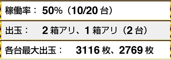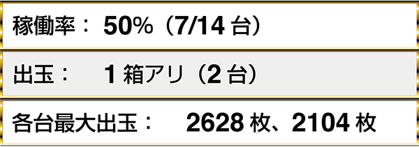 朝イチから人気を集めていた『ハナハナ鳳凰-30』では、6名のプレイヤーが1箱以上の出玉を獲得していた。