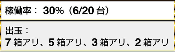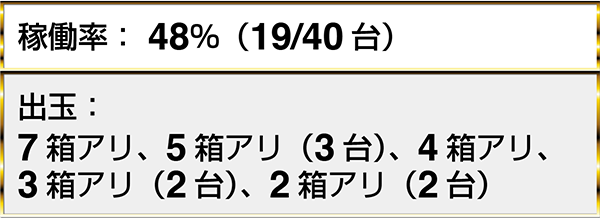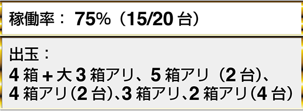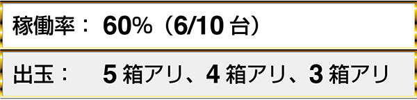 『CR大海物語4』の稼働率は70%を超えており、10台以上で2箱を超える出玉を確認した。