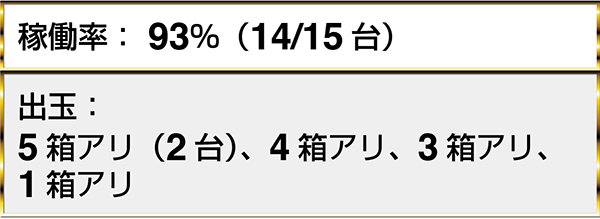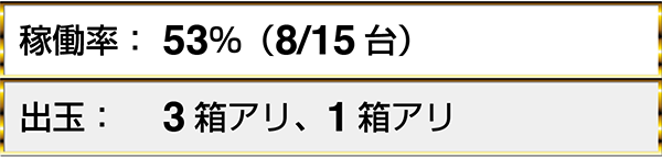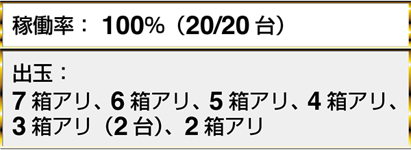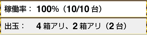 『ミリオンゴッド-神々の凱旋-』と『アナザーゴッドハーデス-奪われたZEUSver.-』が満席となっており、あわせて10名以上のプレイヤーが2箱を超える出玉を獲得していた。