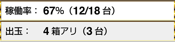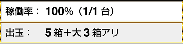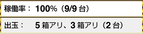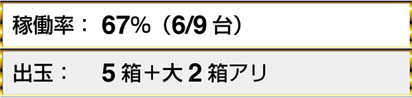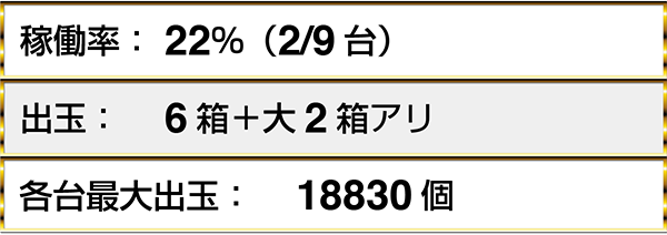 『CR真・花の慶次2』と『CR ミリオンゴッド ディセント』、『CRガールズ&パンツァー319ver.』の3機種で5箱+大2箱以上の獲得出玉がみられた。