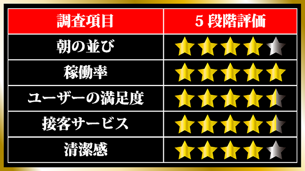 また、楽しげにコミュニケーションをとりながら遊技をしている、プレイヤーたちの姿をみることができたことも印象深い。おそらく、ホールへの愛着を持っている常連のプレイヤーも多いことだろう。