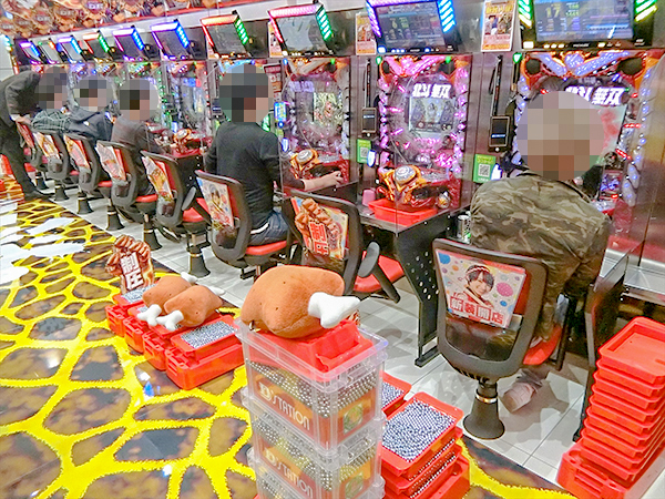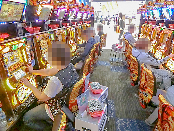 機種ラインナップが多彩な500円/98枚パチスロは、ほぼ満席となるくらいに人気を集めていた。
