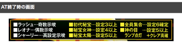 AT終了画面では液晶右に搭載されたピラミッド役モノをタッチしよう。出現する画面に注目で、全員集合のパターンならば設定6が濃厚となる。