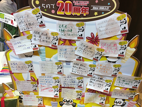 店内をまわっていると、プレイヤーからお店へのメッセージが書かれたボードを発見。あたたかい言葉が多く、愛されているホールであることを実感した。