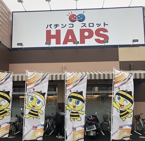 千葉県千葉市の「ハップス東寺山店」へ到着すると、オリジナルキャラクターのハッちんと笑顔のスタッフがお出迎え! ホールの活気に押されないように、最大限にハイテンションで参るとしよう。