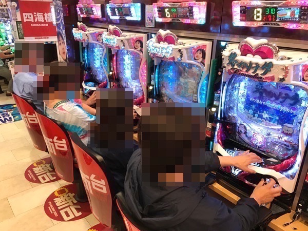 15時を過ぎた頃の4円パチンコでは、「CR大海物語4」や「CR真・花の慶次2」などが盛況。機種のポテンシャルをうまく発揮するプレイヤーが多数存在しており、シマのあちこちから活気が感じられた。