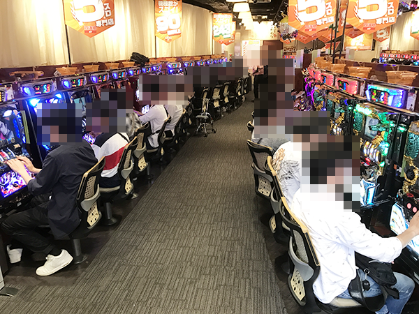 「押忍!番長3」と「パチスロラブ嬢」の活気も大きく、シマ内に広がる光景は華やか。