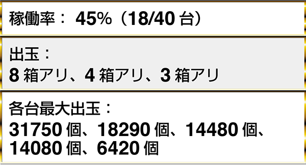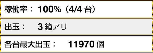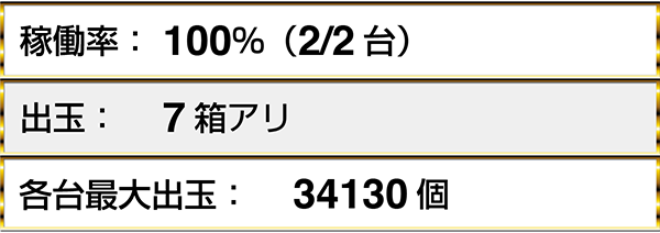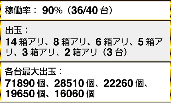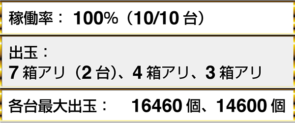 『ぱちんこCR真・北斗無双』は90%が稼働しており、8名のプレイヤーが2箱以上の出玉を獲得していた。