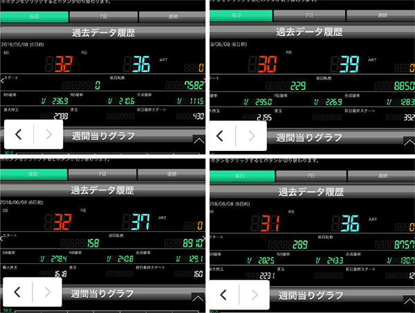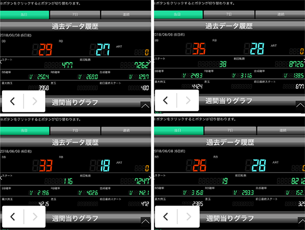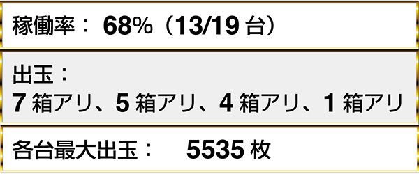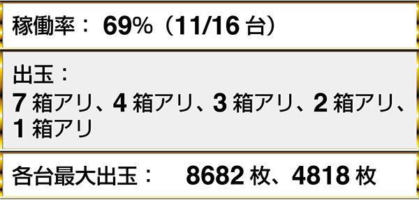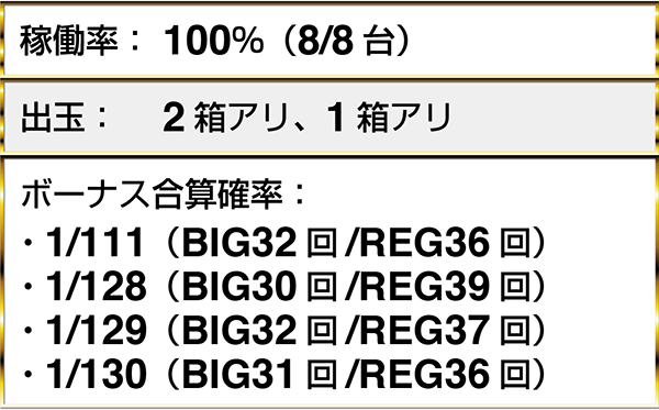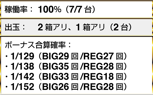『ゴーゴージャグラー』と『ハナビ』がともにフル稼働となっており、5台以上のデータカウンターがボーナス合算確率/130以下を示していた。