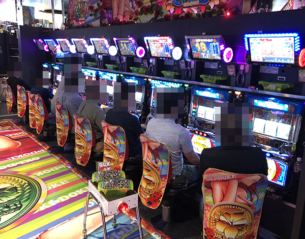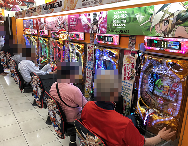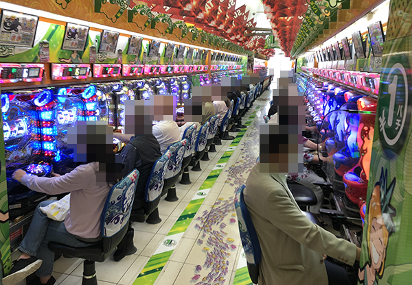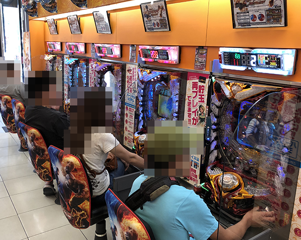 海物語シリーズや「CR牙狼GOLDSTORM翔」などが楽しまれており、プレイヤーたちは満面の笑みを浮かべていた。