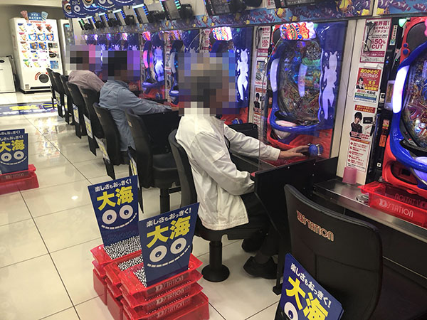 「CR RAIZINMAN 2000×α」も中高年層を中心に人気が高く、イキイキとした表情で遊技をする姿が目立っていた。