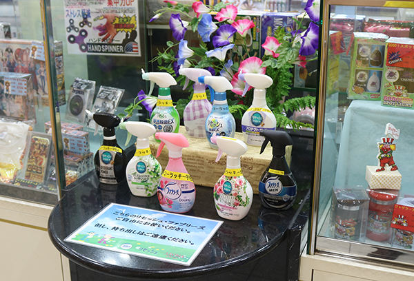 カウンターの前には、消臭スプレーが用意されている。種類も豊富なため、好みの香りもみつかりそうだ。