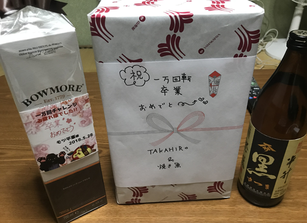 1万回転チャレンジの卒業祝いに、お酒などをもらっていたモツ平峯。