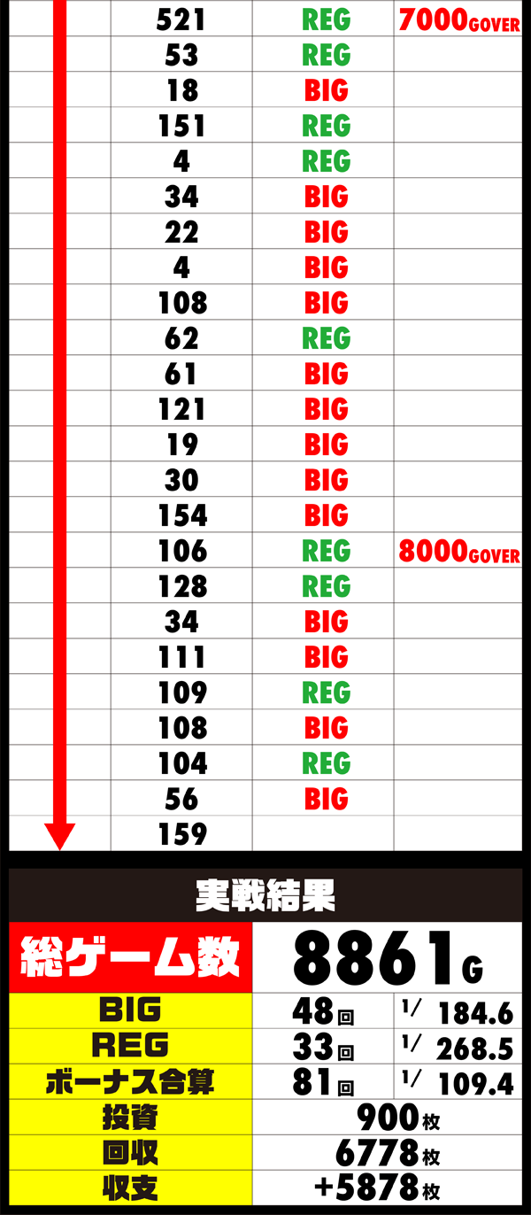 まさに高設定といったボーナス回数に苦戦したのもわかるが、応援の声が多かっただけに、もう少し健闘してほしかった…。
