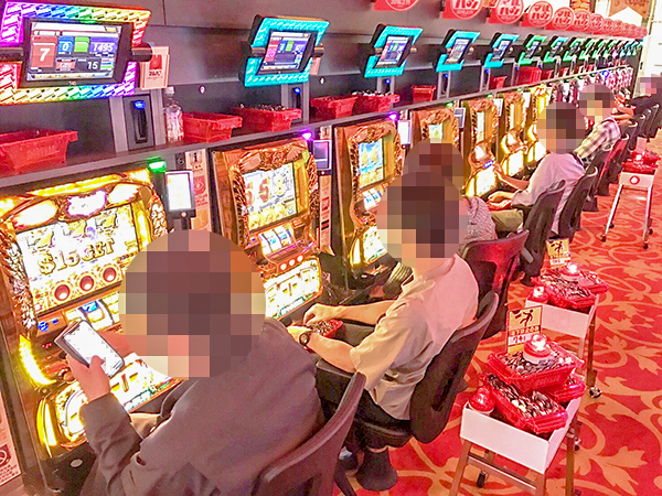 20円パチスロでは、「ミリオンゴッド-神々の凱旋-」や「バジリスク~甲賀忍法帖~絆」、などで華麗なパフォーマンスを披露するプレイヤーが数多く見られ、シマ内は明るい雰囲気に包まれていた。