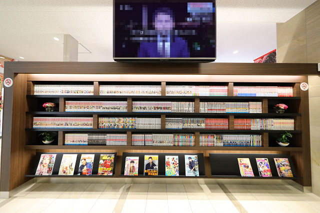 レストスペースにはTVはじめ、多くの漫画・雑誌・新聞などが用意されている