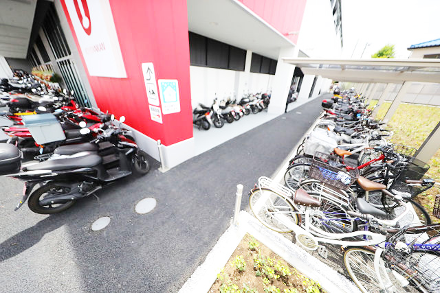 再び外に出ると、店舗前には大規模な駐輪場が広がる。