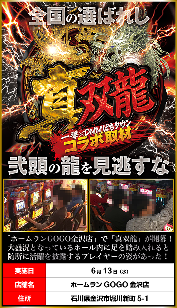 パチンコとパチスロを合わせて、総設置台数が1000台を超える「ホームランGOGO金沢店」で「真双龍」を敢行。