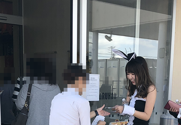 バニーガール風のコスチュームに着替えて、お客様と一緒に開店を待ちます♪