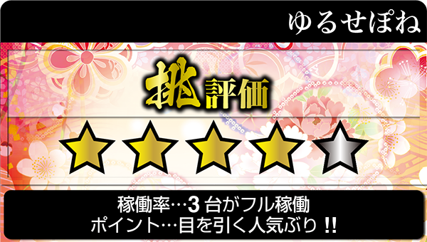 また、新旧さまざまな機種で構成された5円パチスロにもみどころ満載! シマ全体を明るい雰囲気が包み込んでいただけに、支持率の高さと満足度の高さが比例しているようにも思えた。