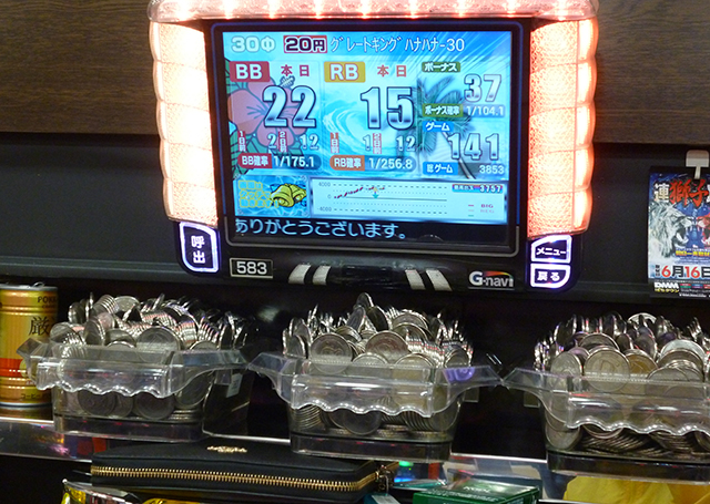 3台並びで台上に持ち玉が並ぶなど、