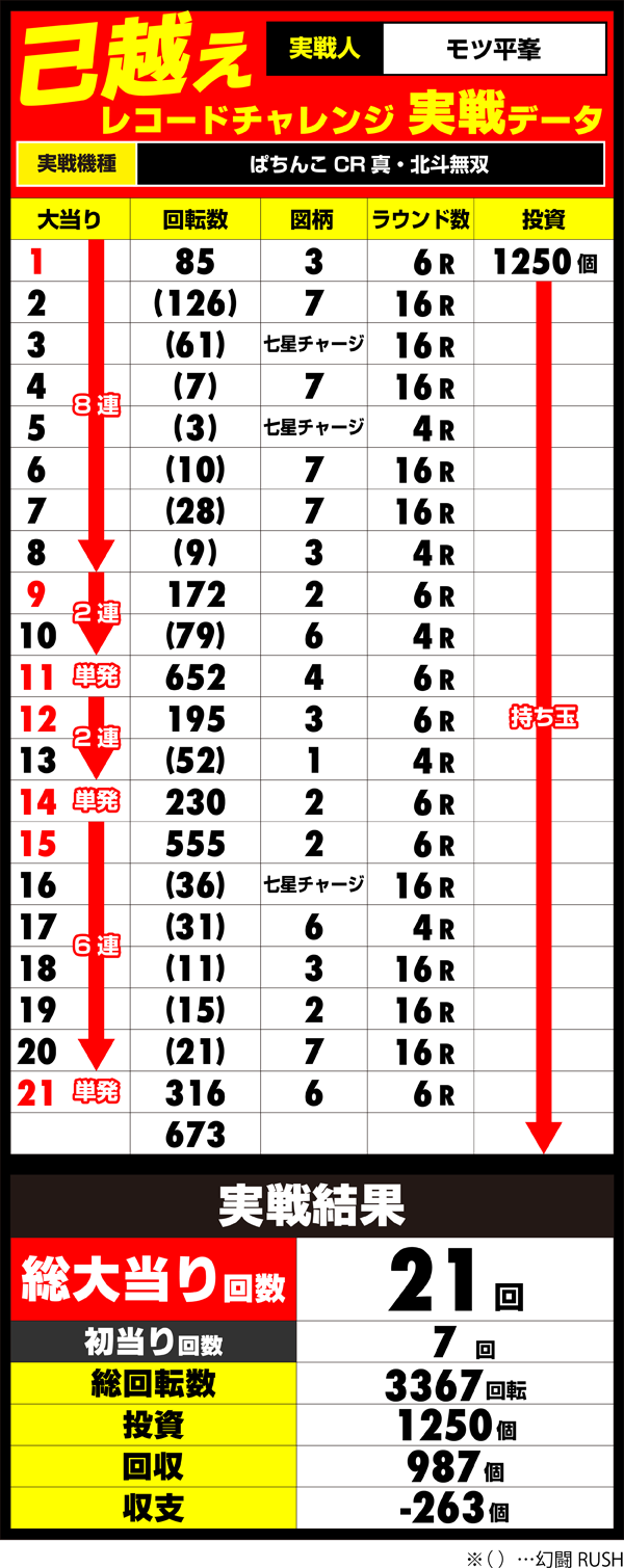 大記録にはまったくとどかず、今回もチャレンジは大失敗。ヒキを強くするだけでなく、立ち回りも考えればちがった結果がみえてくるはずだ。
