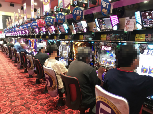 5円パチスロコーナーを確認すると、機種・スペックを問わず様々な遊技台が遊ばれていた。