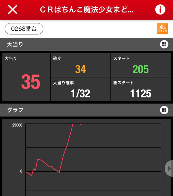「CRぱちんこ魔法少女まどか☆マギカ」にもとびっきりの赤丸をつけたくなる台を発見。プレイヤーがどのような気持ちで楽しんでいたかは、グラフをみてイメージしていただきたい。
