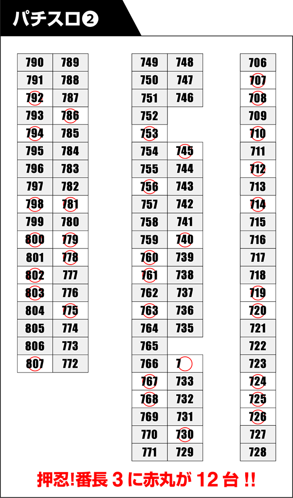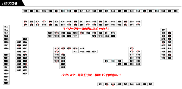 また、27台設置された「押忍!番長3」は、12台が赤丸をつけるのにふさわしい台とボリューム満点であった。