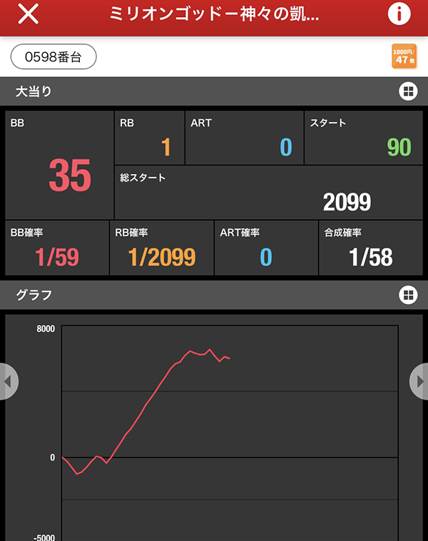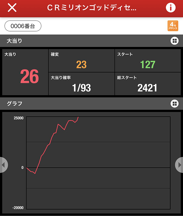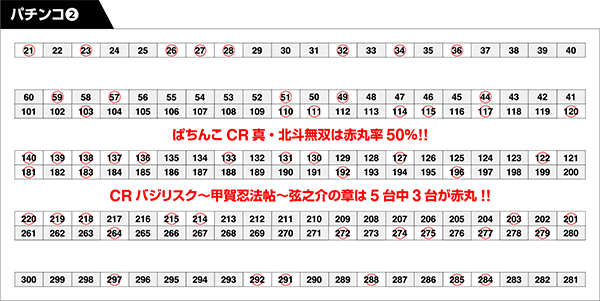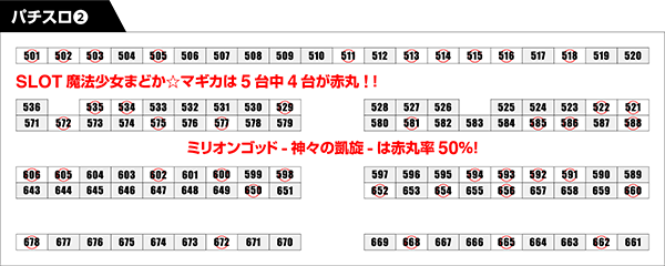 「ミリオンゴッド-神々の凱旋-」では18台中9台に赤丸をチェック。パチスロコーナー内でもピカイチであるように思えた。