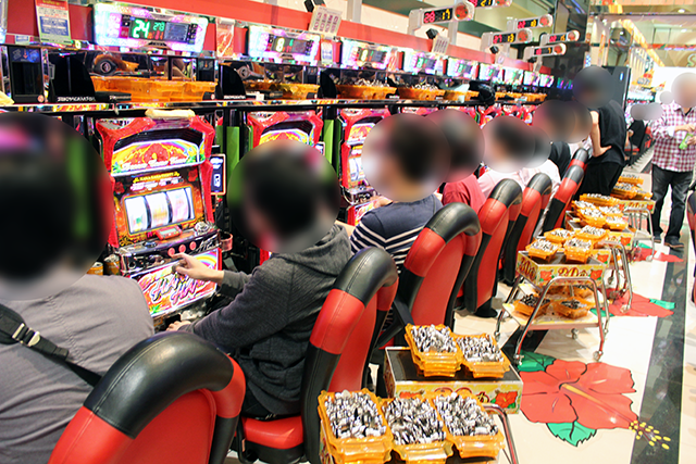 この日の主役は『ドリームハナハナ』だけでなく、大量の別積みの『鳳凰』、並びで別積みする『エウレカ2』、『北斗転生』も日進竹の山店お得意の「やりすぎ」の認定は明らかだ。その他にも『バジリスク絆』・『聖闘士星矢』・『コードギアス2』が目立っていた。