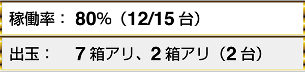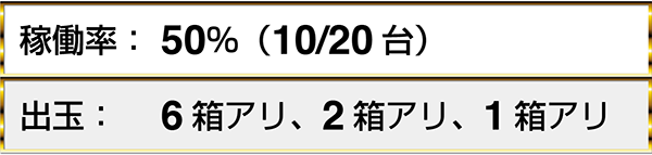 前日に引き続き、『アナザーゴッドハーデス-奪われたZEUSver.-』や『バジリスク~甲賀忍法帖~絆』で6箱を上回る出玉を確認した。